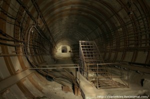 Под этой решеткой спуск на Сырецко-Печерскую ветку. Чуть дальше видно ступени – это свод станции "Золотые Ворота" прорезается в заброшенный перегон.