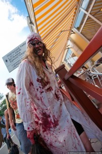 В таких парадах очень важен маршрут. Предпочтительнее тот, на протяженности которого можно удивить отдыхающих в кафе и магазинах людей. Подол – именно такое место, каждые 5 метров – кафе, рестораны, да и заведений под открытым небом множество В чёрном пакете спрятаны настоящие кишки (свиные, прим.автора). А знаете, чем воняет такое добро? – Дерьмом и на всю улицу, так что прохожие непременно закрывают нос. Зато картина достоверная