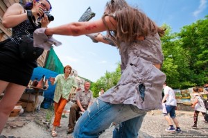 Женщина в оранжевых штанах оказалась слишком суеверной. Подбегая к мясорубу начала его отворачивать в другую сторону, крестить и в голос молиться. В ответ он предложил присоединиться к мертвым, мол, пора уже