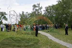 «Флагшток». Каміла Шейнох, Польща (на задньому плані, ібо нормальне фото зробити забув) Ідея. Прапор завжди символізував приналежність до ріної країни, а флагшток – державні інституції з чіткими правилами та жорсткими інституціями. Автор позбавляє флагшток первинного значення і робить його непридатним для вивішування прапорів, а значить, і будь-якої державної пропаганди. Факт. П’ятиметровий «експонат» гнули вже у Києві, бо транспортувати таку конструкцію з Польщі було б дещо заскладно.