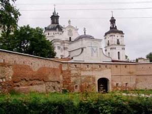 Приехали в Бердичев к монастырю Босых Кармелитов – холодно, как осенью, ветер, звоним Арсеню – связи нет, а они стояли за стеной. Монастырь впечатлял – такая средних размеров крепость, не мудрено, что монахи 14 века умели еще и воевать. Высокие и мощные стены, бойницы, пушки и боевые башни в монастырской стене. Костел и сам монастырь восстанавливают, везде следы ремонта.