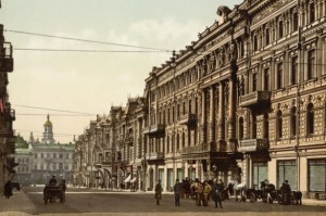 Улица Городецкого. О том, что колорист подбирал нейтральные краски для картинки, подсказывают цвета одежд мужчин в кадре, они недостоверны. Розовое здание на современном фото — то же, что и на старом, это консерватория.