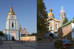 Входы в Михайловский собор и Лавру. Мне сложно судить о технике съёмки пра-прадедовских времён, однако, дисторсии они не избегали: лаврская колокольня стоит ровно, но купол перетянут справа.