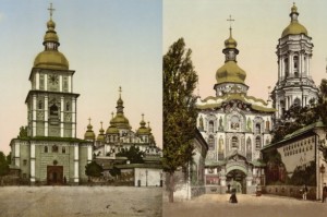Входы в Михайловский собор и Лавру. Мне сложно судить о технике съёмки пра-прадедовских времён, однако, дисторсии они не избегали: лаврская колокольня стоит ровно, но купол перетянут справа.