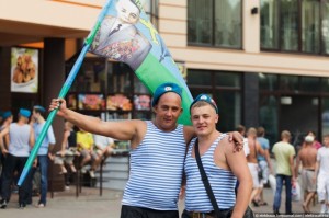Мне совсем не хотелось нарушать уют выпивающей компании и я познакомился с отличными ребятами, Сергеем и Димой, которые как раз очень хотели пофотографироваться. Ещё у них был флаг с "дядей Васей", основателем ВДВ. Вместе мы двинулись гулять, размахивая флагом