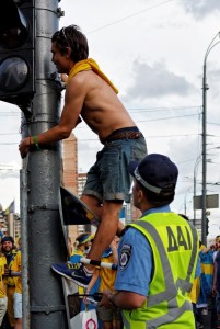Знак оприходован. Первым посягательство на икону заметил гаишник. Он подошел к шведу, сначала легко схватил его за голень, но тот даже не заметил, затем пару раз легонько постучал полосатой ложкой по ноге, но без разницы. Рядом стоял беркутовец, спросил у него, мол, так и будем смотреть, тот ничего не ответил. В то время шведы уже повисли на мачтах. Вообще, лично мне этого знака даже не жалко, потому как лампочек в подъездах и прочего имущества, которого свои же доморощенные втихаря бьют каждый день, намного больше. А эту жестянку можно руками выгнуть в обратную сторону. Смущает другое. Они когда лезли, задумывались, что если свалятся, а падать там есть на что с такой высоты, то своими травмами испортят праздник своим землякам? Спросил у шведов, дома они так тоже делают. Все улыбнулись и утвердительно закачали головами.