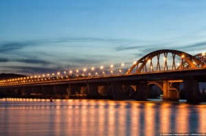 А теперь мост. Самый красивый мост в Киеве – Дарницкий мост. На макетах он светился ярко-синим цветом с белыми арками, в жизни выглядит вот так с одним нюансом – обычно ночью подсветки нет, а фонари могут гореть только днем. Мелочи 🙂