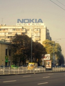 На выступе крыши недалеко от м. Печерская появлялись рисунки и надписи нескольких райтеров, но их снова и снова закрашивали, пока наконец не водрузили рекламу Nokia. И однажды под ней появилось вот это послание. Любовь побеждает бабло!