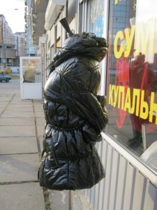 А вот это я снял у себя на Оболони. Воля ваша, но есть в этом что-то зловещее, садистическое: стоит вот такой человек без головы, еще и со связанными за спиной руками.