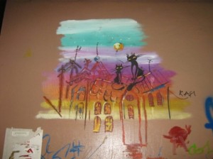 Нижеследующие рисунки обнаружил в подворотне на Контрактовой со стороны Верхнего Вала. Поразительно отличается от обычных граффити: настоящая живописная работа кисточками. Может, даже акварелью рисовали.