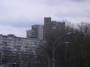 А вот это так называемый "комсомольский дом",построенный в 1976 году ,по какому то уникальному проекту.В своем роде он единственный в Киеве.В те годы это была суперсовременная высотка,почти небоскрёб и на нем стоял огромный герб УССР.Мы в 80-е годы частенько тусовались на его крыше.В то время крыши домов часто не закрывались. А на "чешке" ,что пониже была надпись "Слава Радянськой Україні",которую после 1991 года демонтировали.