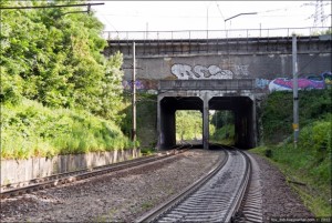 Так это выглядит со стороны железной дороги. За бетонной стенкой скрываются тоннели, над ними проложена автодорога. Ее, кстати, проложили не сразу, а лишь в начале 80-х.