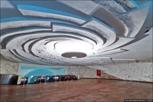Поднимемся в вестибюль. Тот редкий случай, когда вместо простых перекрытий и стен было сделано нечто большее. Эскалаторный зал станции целиком является композицией "Спираль времени". Построенная из горельефов и барельефов, расположенных на стенах зала и олицетворяющих собой исторические события, спираль уходит на свод, закручиваюсь вокруг большой люстры.