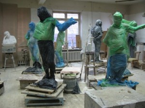 Завёрнутые в разноцветный полиэтилен глиняные скульптуры. С сухой глиной работать невозможно. Скульптура же лепится неделями. Оставленную до завтрашнего дня работу приходится накрывать мокрыми тряпками. А сверху ещё заматывать полиэтиленом — чтобы тряпки не сохли.