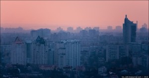 Над городом догорали закатные краски, уступая место сумеркам. На фото: Соломенка, ЖК "Времена года" на переднем плане и здание апеляционного суда в правой части кадра