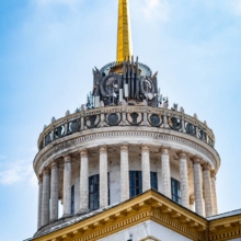Головний павільйон №1 – найвища споруда на ВДНГ, 67 метрів. За іншим проєктом він міг би виглядати зовсім інакше. Раніше відвідувачі могли тут отримати путівник по ВДНГ, дізнатися, які виставки проходять в інших павільйонах. Зараз у павільйоні проводяться різноманітні виставки та фестивалі. А от доступ на ротонду головного павільйону відкритий був лише для почесних гостей та іноземних делегацій. Саме сюди під час екскурсії ми і піднімемося, …