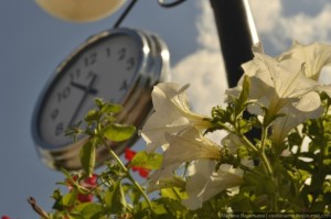 На столбы повесили горшки с цветами и прицепили в некоторых местах часы (довольно дешевые на вид). Практично.