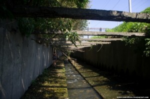 Тут реку хотели заключить в коллектор, да что то не срослось. Остались только бетонные балки-скелеты перекинутые через берега.