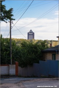 Хотя внизу проходит оживленная улица Олены Телиги. Достаточно сделать пять шагов в сторону и видно здание телецентра. Вечным наблюдателем высится над местностью телевышка.