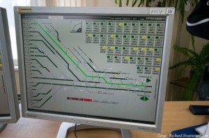 На мониторе показана траектория движения поезда. Видно, что поезд принимается на 23 канаву.