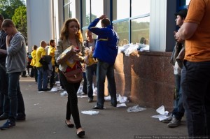M-ки, S-ки XS-ки быстро закончились, раздавали что осталось. Их тут же надевали, тут же выкидывали пакет и бумагу.