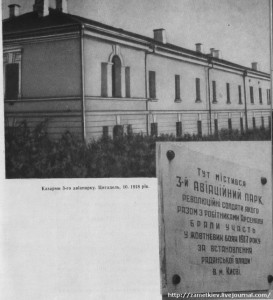 Отгремела гражданская война, и теперь казармы стали корпусом 1-й обувной фабрики, которая еще с 1867 года по указу Александра 2-го обеспечивала экипировкой царскую армию. В декабре 1952 в честь 35-летия революции на корпусе казарм была установлена белая мраморная плита с позолоченной надписью: “Здесь находился 3-й авиационный парк, революционные солдаты которого вместе с рабочими Арсенала принимали участие в октябрьских боях 1917 года за установление Советской власти в г. Киеве”. Автор – архитектор И. Л. Шмульсон, эта плита до наших дней разумеется не дожила. В середине 60-х годов, в бывших казармах был надстроен 3-й этаж, а сама 1-я обувная фабрика вошла в состав производственного экспериментального объединения “Киев” имени 50-летия Великой Октябрьской революции.