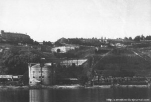 Вернемся в прошлое. Фото конца 19-го века. Сверху вниз объекты Новой Печерской крепости: Никольские ворота, Верхняя и Нижняя подпорные стенки, Подольские ворота (снесены в 50-е годы прошлого столетия) Верхнюю полукруглую оборонную стенку, с казематами в правом врезном гласисе возвели в 1853-1855 гг.Она предназначалась для прострела участка Набережной дороги и Днепра, с косогора местности Провалье, и укрепления оползнеопасных склонов, для чего была построена разветвленная сеть подземных дренажей. Отличительной чертой Верхней стены от Нижней,(возведенной в 1856 году) , является наличие у первой мощных укрепительных контрфорсов.