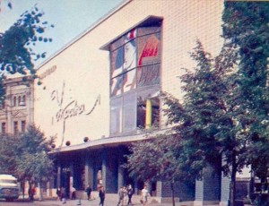 26 мая 1964 года. Улица Карла Маркса, д. 7. В этот по-летнему теплый день состоялось торжественное открытие кинотеатра Украина — самого первого киевского широкоформатного кинотеатра. Авторами проекта здания кинотеатра были архитекторы Л. В. Добровольский, А. Я. Косенко и В. А. Созанский. Фотография фасада кинотеатра украшенного стеклянным витражным эркером (художница З. А. Рогачева), который в 1980 году был изменен на орнаментное панно, еще долго не сходили с передовых столичных газет. 1967 год. Кинотеатр "Украина"