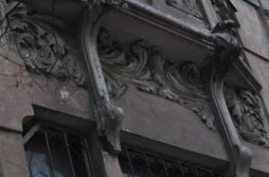 Чотирьоповерховий ризаліт увінчує плоский звис карніза на стилізованих кронштейнах, триповерховий об’єм – карниз із фризом з листям аканта.