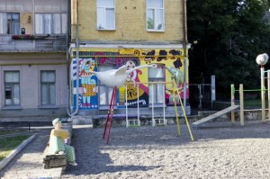 Здається, тут на першому поверсі дитяча музична школа. Три роки тому, коли почали з цієї простої асфальтової доріжки робити туристичний атракціон, побудували ось такий дитячий майданчик. До речі, під ногами замість піску прикольні маленькі камінці.