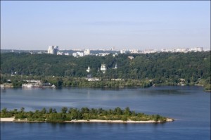 Выдубицкий монастырь, ЖК «Триумф», Теремки и Голосеево на горизонте.
