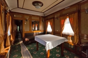 Вагоны неплохо отреставрированы, свежий лак на деревянных поверхностях, чистые занавесочки, интерьер выглядит почти как новый. Жлобские полосатые половички преследуют посетителя выставки во всех вагонах )