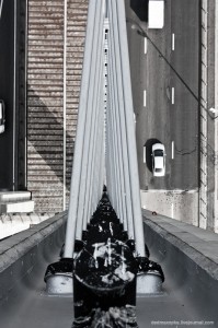 Ванты "Башенноподобный пилон Южного моста виден практически из любой точки города. Он поднимается на высоту в сто десять метров, а это даже на десять метров выше, чем башня Московского вантового моста. Некоторые киевляне сравнивают Южный мост с серебристой арфой, которую держит в руках какой-то небесный великан. А ученые отмечают, что подобное сравнение отнюдь не беспочвенно. Тросы, с помощью которых удерживается мост, изгибаясь на ветру, издают звуки, напоминающие глубокий мужской бас." – даже так, но честно говоря, звуков кроме автомобильного грохота мы не слышали, хотя ветер был 🙂