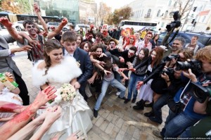 На пути встретилось несколько свадеб, все остались довольны. С этого места толпа зомби прогнала прогуливающуюся свадебную процессию Особенно довольна осталась эта парочка. Жених начал махать кулаками